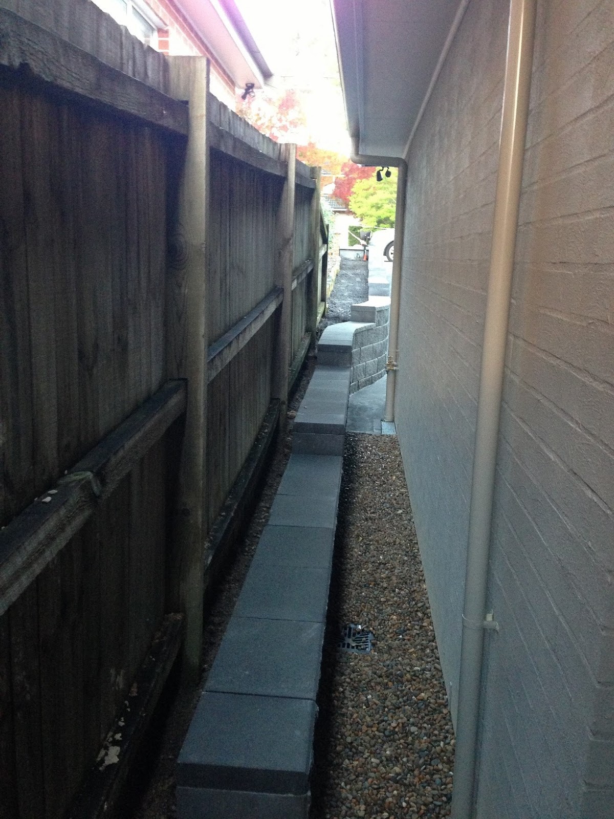 Here's the latest shot from the front of house. The grass is down, the retaining wall is complete. Pebbles are laid down each side along with pavers. You might notice the grass is pulled up next to the driveway - this is because one coat of sealer remains to be applied -